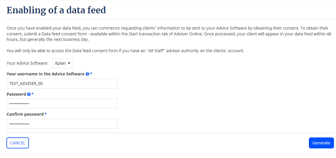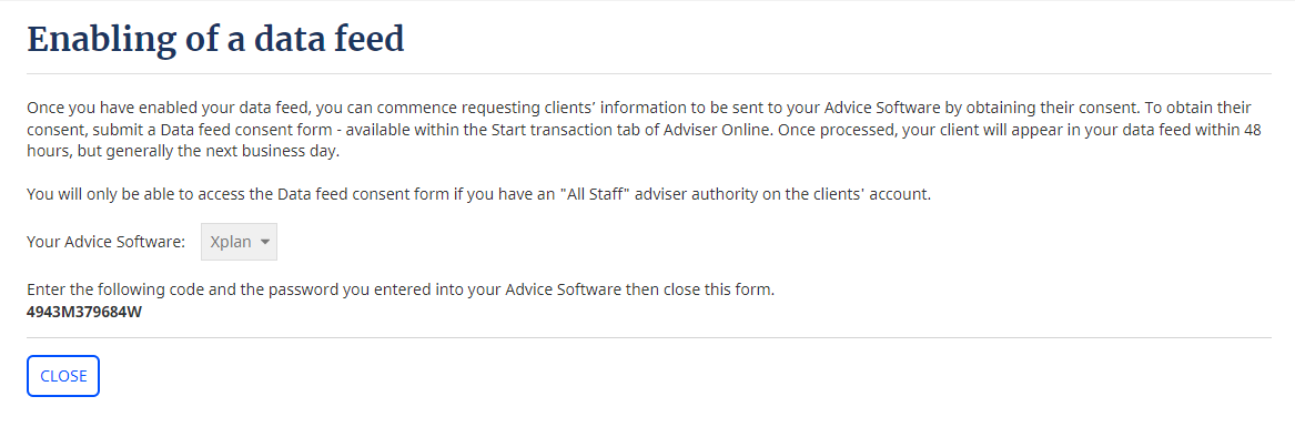 - Click on generate and you will be provided an adviser code. This code needs to be entered into your advice software in the appropriate location along with the password you set in step 4.
